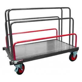 Chariot porte-panneaux avec mâchoires de serrage automatique une fois la charge posée. Intérieur de la mâchoire recouvert de tapis pour protéger les charges fragiles Pour la manutention de panneaux, tableaux, décors. Chariot porte-panneaux avec mâchoires de serrage automatique...