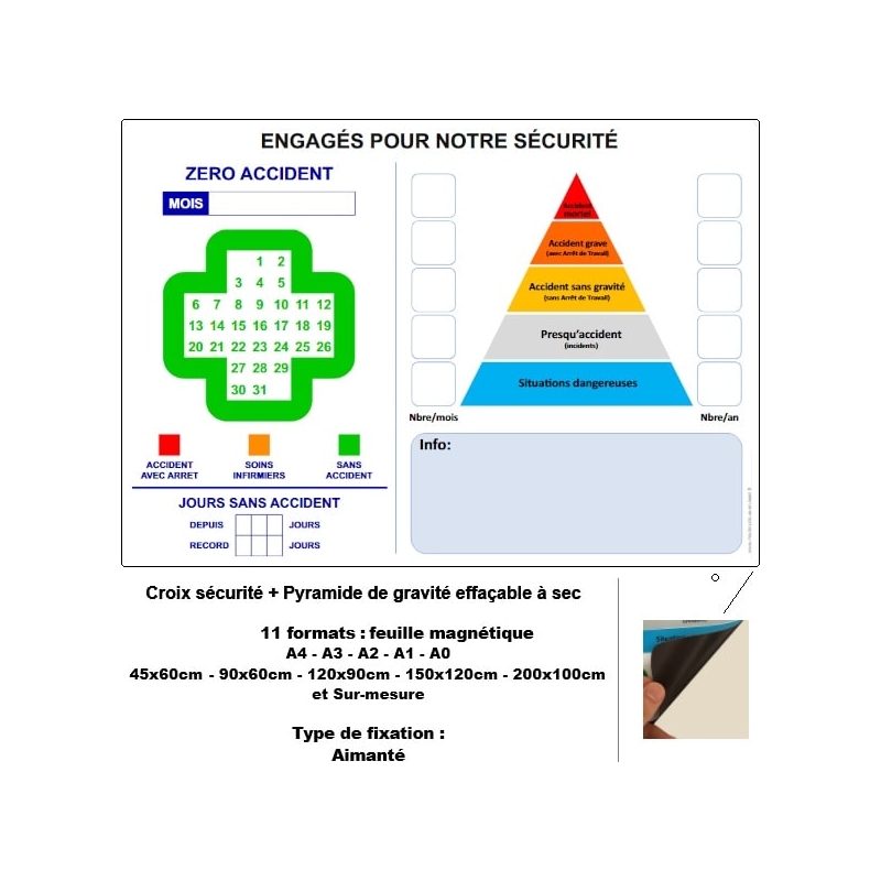 L’affichage d’une croix sécurité avec pyramide de gravité, imprimée sur feuille magnétique effaçable ou support adhésif, constitue un levier simple et efficace pour piloter la sécurité au quotidien. Il rend visibles les incidents, structure la prévention et engage les équipes dans une vigilance partagée.
