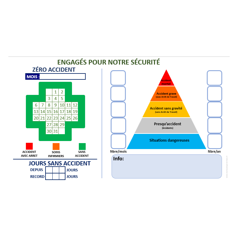 Un des moyen efficace pour suivre les accidents de travail de votre secteur et d'améliorer votre performance gràce à cette Croix Sécurité + pyramide de gravité sur tableau magnétique effaçable A1 (90cm x 60cm) - Une autre version d'indicateur de Sécurité en "S" est disponible en suivant ce lien)